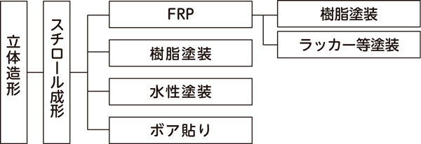 一方、スチロール造形後に水性塗装や樹脂塗装だけで済ませる方法もあり、この方法はコストを抑えることが可能です。しかし、水性塗装の場合は光沢感に欠け、樹脂塗装の場合は衝撃に弱くヒビが入り易いという問題があります。短期間だけ手が届かない場所に設置する場合であれば、この方法も選択の一つです。