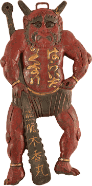 江戸時代、商業の発達に伴い他との差別化や有効的なアイキャッチにより集客を図る必要もあった。そこで、家紋と組みあわせたり商品の形をした看板に文字を入れるといった工夫を凝らしたデザインもされた。例えば、分銅型をした両替商の看板や壺型をした飴屋の看板などが普及していた。腹痛のくすり看板に使われていたのは鬼。店舗にとって看板の鬼はシンボルであり、キャクターともいえる。よく効くことを暗に伝える「鬼に金棒」も洒落も効いている。