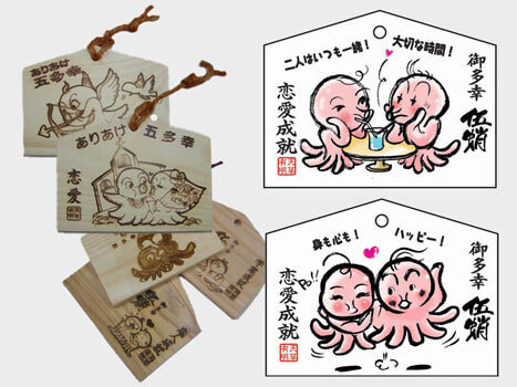 試験に強い「置くとパス」、恋愛成就の「ひっつきダコ」、健康運の「タウリンダコ」、商売繁盛の「ひっぱりダコ」、子宝・子孫繁栄の「タコ姫&タコ太郎」で構成されています。供養塔のデザインや碑文作成のほか、天草への来島者に少しでも幸福感を持っていただけるようにグッズ開発もしました。