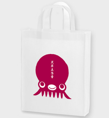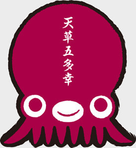 天草の食品開発の際にデザインされたタコのキャラクター「タコ坊」です。商品はタコを使ったお菓子の黒棒でした。