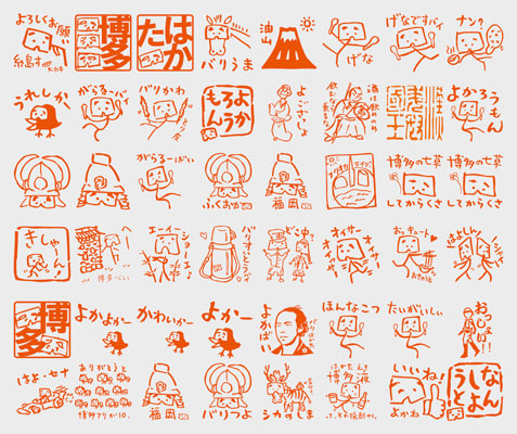 小金丸彫刻工業さんが絶賛販売中なのが博多弁を使った「博多ゴム印」だ。「バリかわ」(とってもかわいい)、「してからくさ」(〜してね)、「ほんなこつ」(本当に)・・・といった博多の人にはわかる方言がキャラ入りで描かれている。