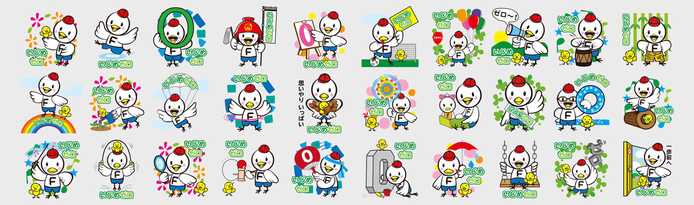 スタンバードは福岡市教育委員会によって策定された小中学校を対象にしたキャラクターです。平成21年からスタンバードは既に存在しておりましたので、それをデザインしたわけではなく、「いじめゼロイベント」の際にいじめゼロを訴求するシール制作にあたり、ポージングの開発をしました。特にスタンバードの相棒にヒヨコを作成しています。