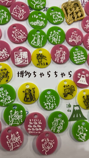な〜んか博多んアクセサリーごつある「博多ちゃらちゃら」は福岡アピールのチャームです。今のところ、博多弁バージョンと愛犬家用の二種類が確認されています。直径2cm、厚み2㎜の円形アクリルにイラストや文字がレーザーで刻まれた単純アイテムですが、何んか気になります。